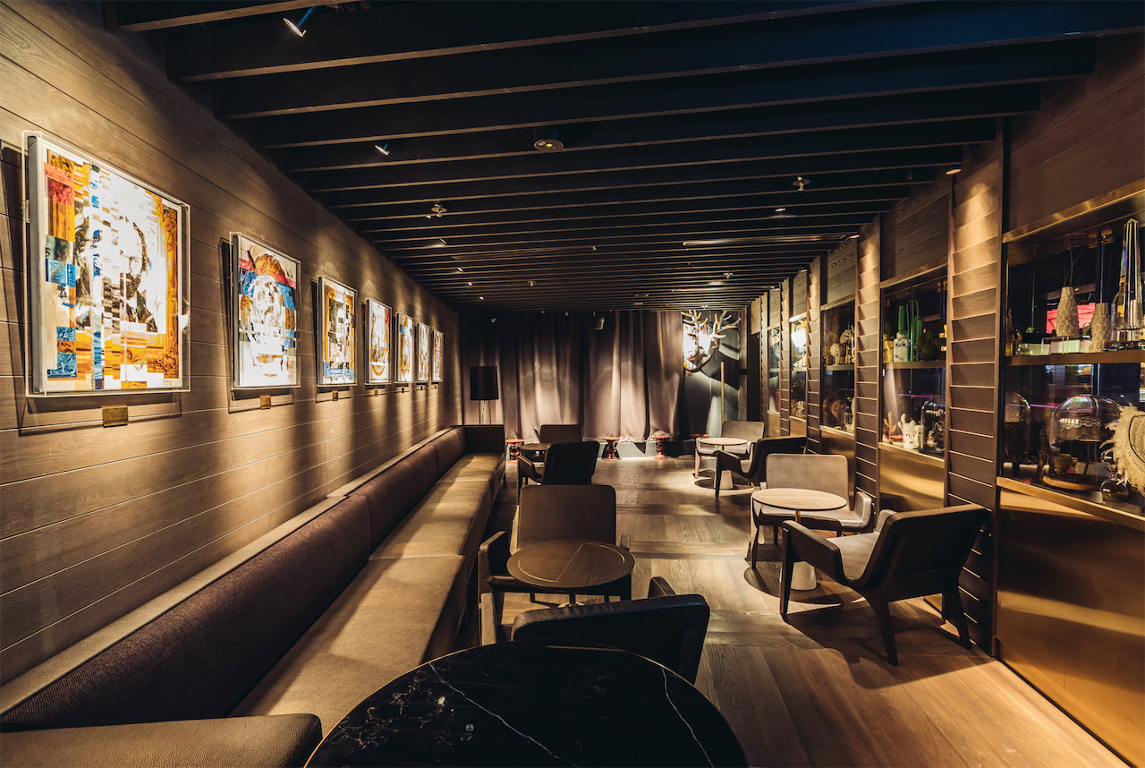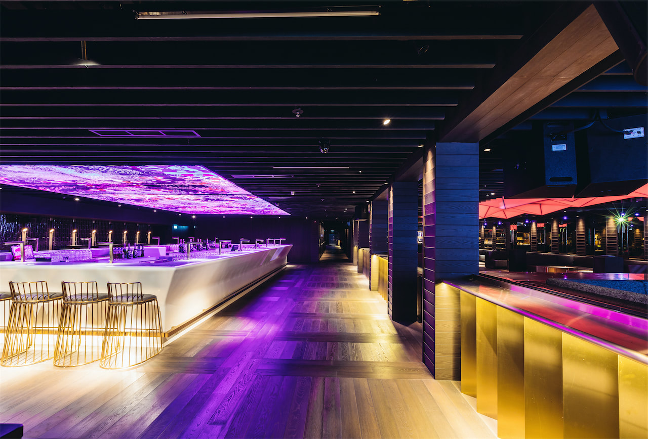 Additionally, there is an LED screen behind the oval DJ booth with curated content to complete the necessary media elements of this modern and luxurious space.
