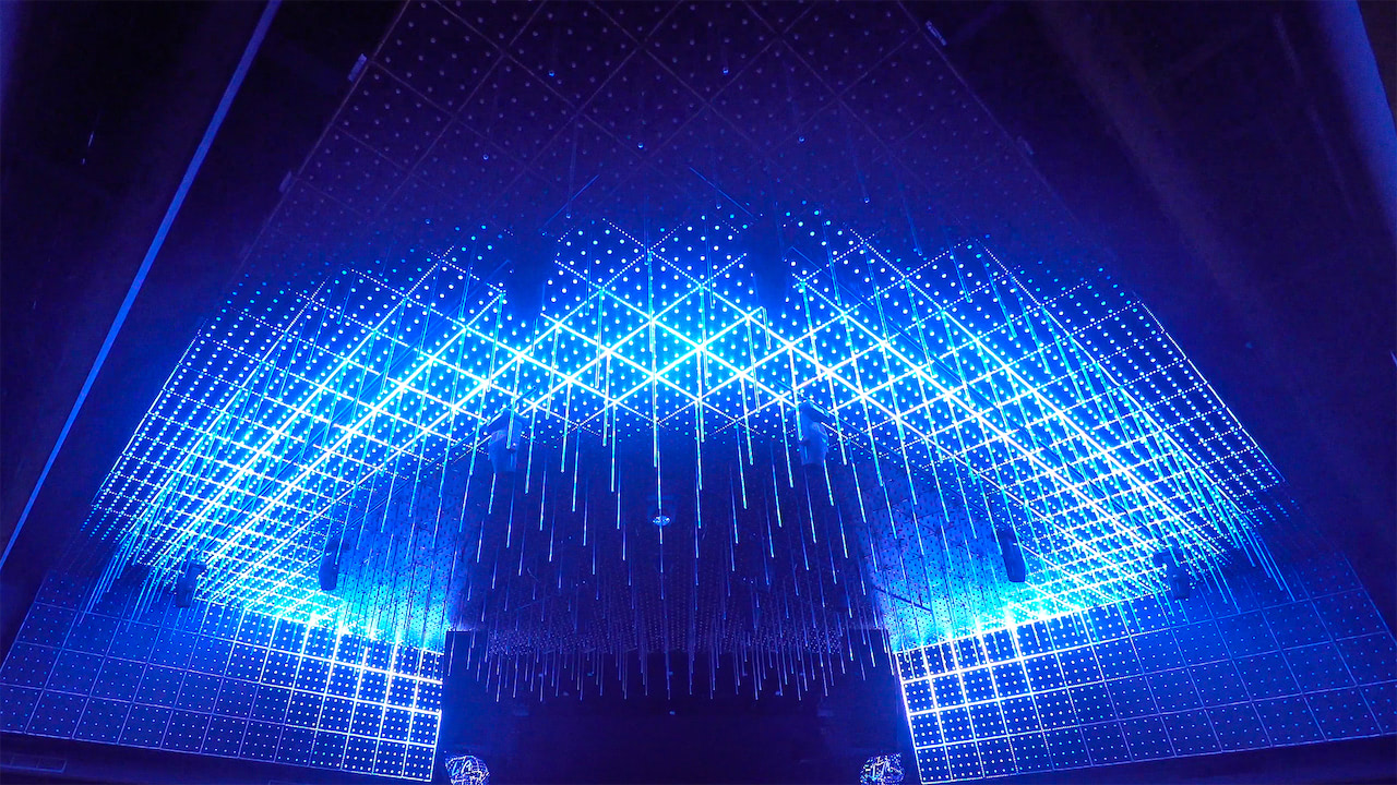 Our recommendation was to update the system with the latest in LED lighting and control technology. The design is based on the original diamond shape of the ceiling. In order to highlight this unique characteristic and to turn it into a huge 3D lighting object, three types of LED fixtures were deployed: 1. Around 9000x 30 mm LED pixel lights with a milky cover, 2. Around 420x 1 m vertical LED tubes, and 3. around 756 m of soft LED stripes. All of these fixtures, and over 160 DMX universes in total, are controlled with a complete lighting control system that includes 20x MADRIX NEBULA hardware units and 1x MADRIX KEY ultimate software controller.