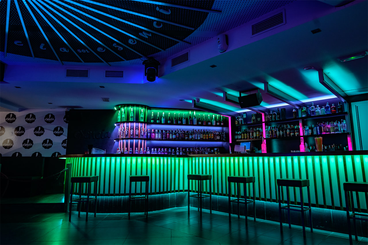In order to achieve this goal, around 1 kilometer of digital LED stripes with 60 LEDs per meter were installed inside aluminum profiles with light diffusers on top. You can see the linear elements all around the venue; in front of the bar and behind it, along the pillars and the DJ booth.