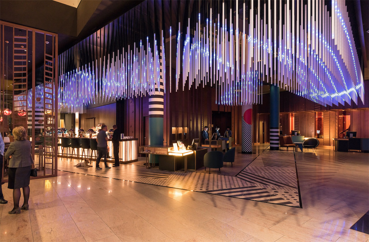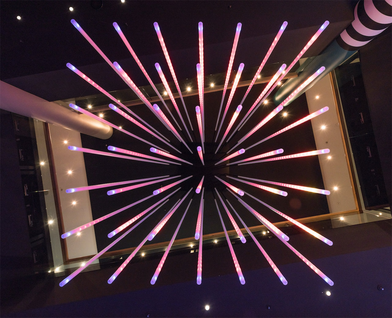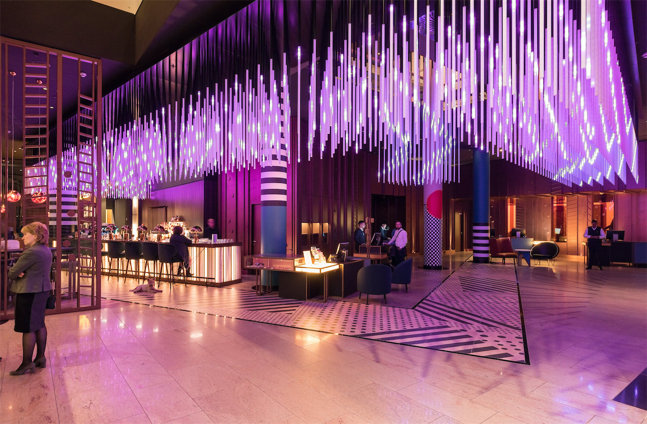 The interior design of the entrance, bar, and restaurant area of this five-star hotel in Berlin was to follow two main design criteria: the German Bauhaus design style and 'zoo' as design theme, an inspiration caused by the proximity to the Berlin Zoo. A volumetric, three-dimensional light sculpture as key element of the interior design was translated into an 18 m wide and 10 m deep 3D LED installation comprising of nearly 900 custom-designed, 360-degree viewable LED tubes made by eFour Media Architecture in a high-quality architectural finish. Content for the volumetric LED install with individually-controllable pixels is generated and scheduled using a MADRIX server that outputs DVI video data in 'mapping mode' to the central video processor of the LED install.