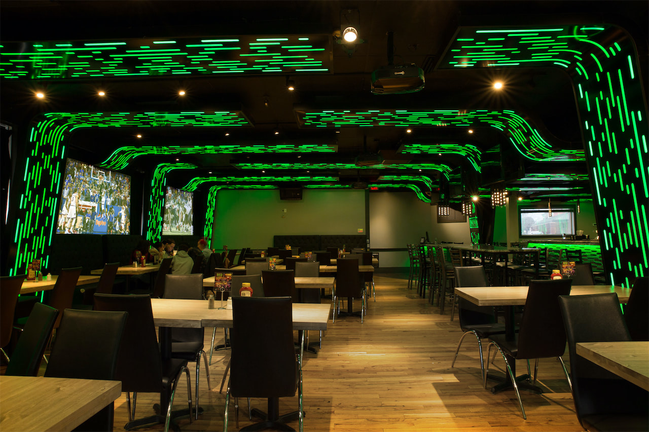 We achieved this by designing a series of linear, aluminum light boxes. These aluminum structures where all built off site and delivered with all of the lighting already pre-installed. We took this approach to reduce the amount of days that this establishment had to close for. This business was only closed for 9 days while renovations were being conducted. We are pleased to say that the project was an overall success and that the end product we created speaks for itself.